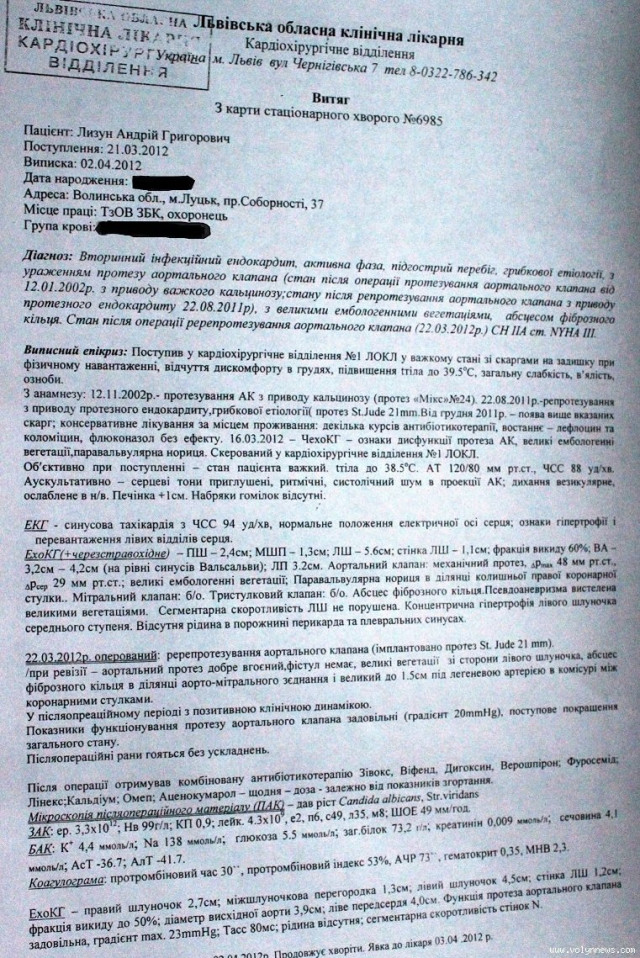 Лікар також додала, що діагноз Андрія Лизуна невтішний – вторинний інфекційний ендокардит протезу аортального клапана, а сподіватися залишається тільки на те, що за допомогою «Віфенду» та інших медпрепаратів чоловікові вдасться подолати інфекцію.
