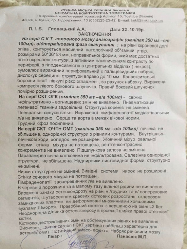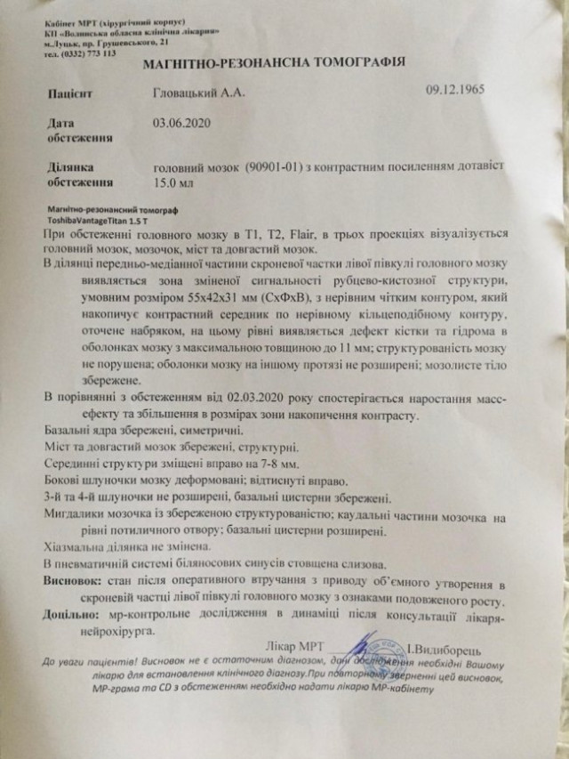 Планове МРТ 3 червня 2020 року підтвердило рецидив хвороби, пише ВолиньPost.