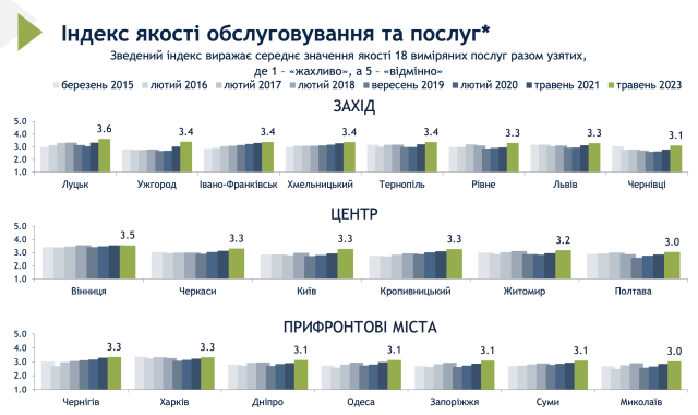 Луцьк виборов першість серед обласних центрів України за комфортом. Індекс якості обслуговування та послуг, визначений на основі 18 показників, у Луцька вищий, ніж в Ужгорода, Івано-Франківська, Хмельницького чи Львова.