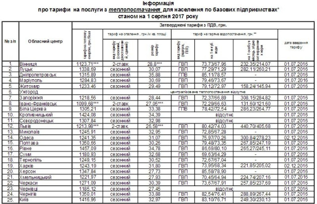 Тарифи на централізоване опалення житла в столиці України, а також в обласних центрах Рівне та Кропивницький, є найвищими в країні та становлять відповідно 1416,96 грн/Гкал, 1457,09 грн/Гкал та 1424,08 грн/Гкал. За ними у списку – Луцьк, де мешканці платять 1338,69 грн/Гкал.