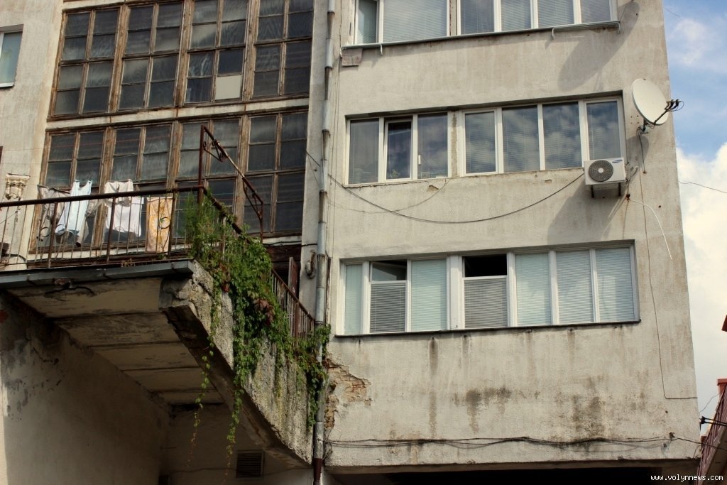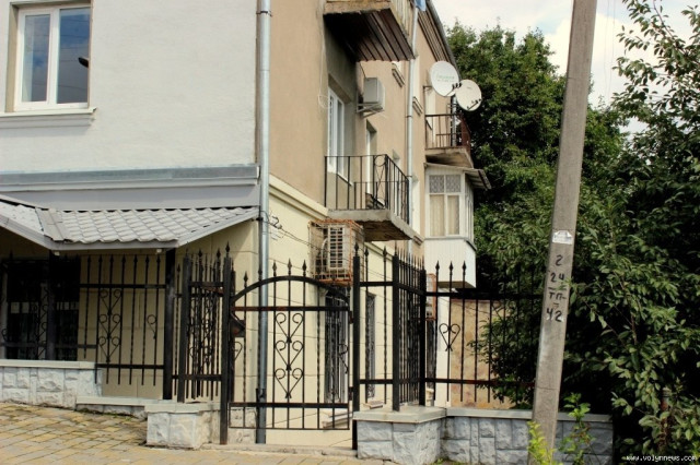 Значно цікавіше і колоритніше цей будинок виглядає із двору. На другий поверх ведуть довгі сходи. Та й загалом вікна оздоблені рослинністю.