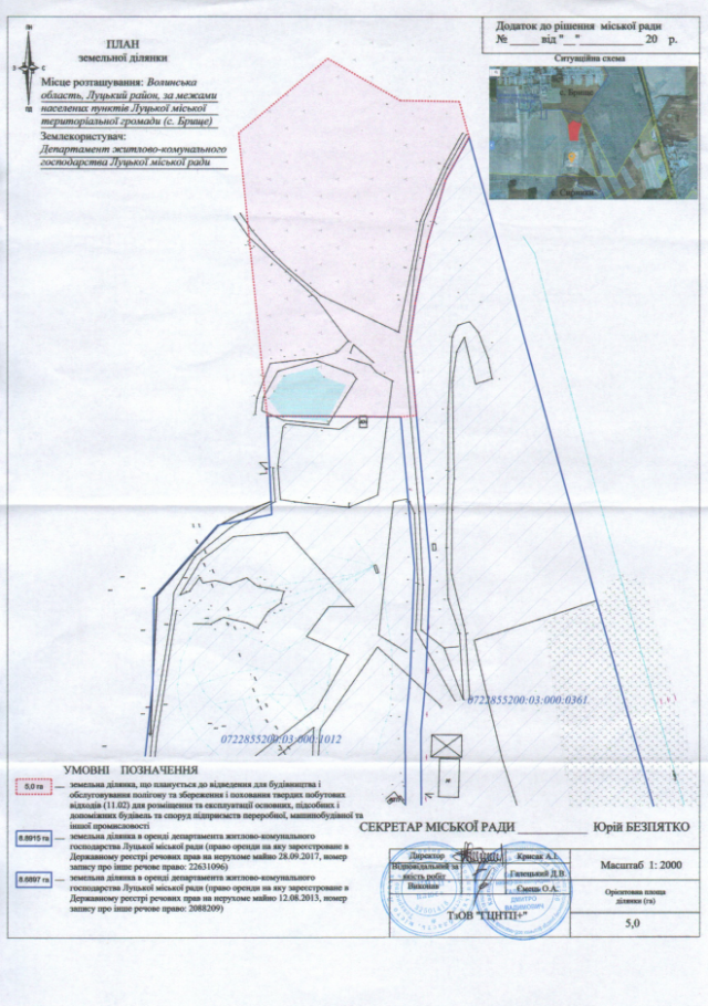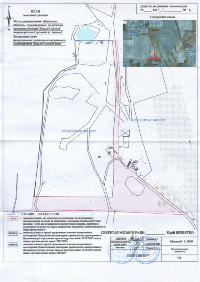 Департамент отримав дозвіл на розроблення проєкту землеустрою щодо відведення двох земельних ділянок за межами населених пунктів Луцької міської територіальної громади (с. Брище) орієнтовною площ п’ять та чотири гектари для будівництва та обслуговування полігону та збереження і поховання твердих побутових відходів (11.02), для розміщення та експлуатації основних, підсобних і допоміжних будівель та споруд підприємств переробної, машинобудівної та іншої промисловості.Нагадаємо, у червні почали готувати містобудівну документацію, аби розширити полігон у Брищі.