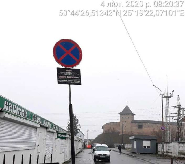 «Люди, які з суботи перекрили вулиці Замкову та Глушець своїми авто (проїзд вулицею, тротуари, ворота) з порушенням ПДР ч.1 та 3 ст.122 КУпАП з метою уникнення відповідальності розвернули знак 3.34 в сторону Замку Любарта.