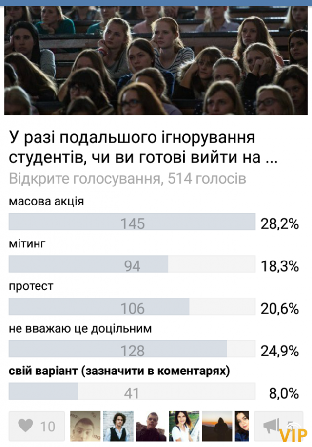 У коментарях же до опитування, створеного у соцмережах, Юрій Громик написав: «А якої думки відмінники, які мають шанс отримати 1600 гривень академічної стипендії? Теж бунтуватимуть за повернення до 800 гривень? Якої думки студенти 7 пільгових категорій, які відтепер отримуватимуть 1000 гривень соціальної стипендії, навіть якщо на академічну стипендію «не витягують»? Очолять протести? Просто роздуми».