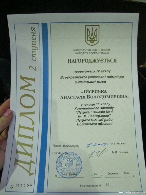 «Я вже втретє представляла честь Волині на 4 етапі Всеукраїнської учнівської олімпіади з німецької мови. Два роки поспіль я привозила другі місця нашому краю. Цього року я також не підвела і здобула перемогу.