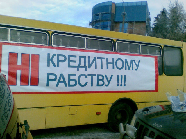 Учасники акції «Ні кредитному рабству!» поділилися на дві колони. Одна із них відвідує волинські філії банків та передає керівнику фінустанови звернення протестантів. У ньому, по між іншим, вимагається: