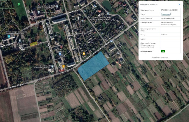 стартова ціна – 452 495 грн;- у селищі Рокині (навпроти перетину вул. Лесі Українки та вул. Героїв України), площа – 1,3818 га, кадастровий номер – 0722855200:02:001:0160, категорія – землі житлової та громадської забудови, цільове призначення ‒ для будівництва і обслуговування багатоквартирного житлового будинку з об’єктами торгово-розважальної та ринкової інфраструктури;