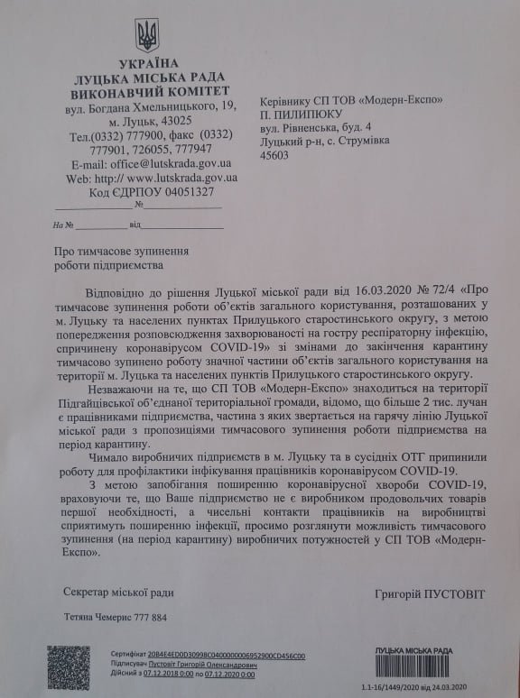 Секретар Луцької міської ради Григорій Пустовіт звернувся до керівника «Модерн-Експо» Петра Пилипюка щодо можливості призупинення виробничих потужностей на час карантину.
