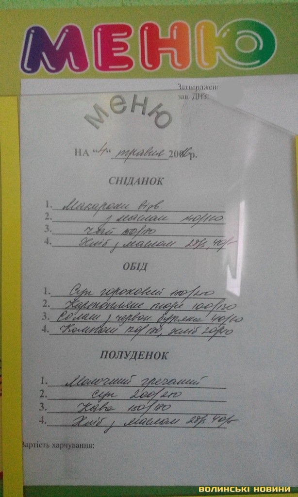 На обід дітвора мусить смакувати гороховий суп, картопляне пюре, салат з буряка та компот. А на вечерю їм подадуть молочний гречаний суп, каву (кавовий напій, - ред.) та хліб з маслом.Зауважимо, згідно з оприлюдненою інформацією міського управління освіти, усі тендерні закупівлі м’яса птиці, яловичини, свинини для луцьких ДНЗ вже відбулися. Та чому сьогодні дітям не приготували м’ясних страв – невідомо.Кореспонденти Інформаційного агентства Волинські Новини вирішили з’ясувати причину такого пісного меню для луцьких дітей у начальника міського управління освіти Олега Гребенюка.