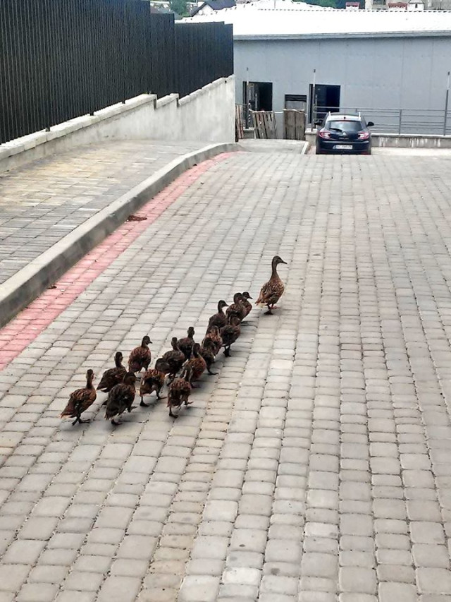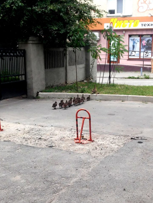«Цікавість до подорожей, до чогось нового притаманна не тільки людям. Сьогодні довелось спостерігати ось таку картину. Мама-качка та її каченята гордо мандрували проспектом Волі. Вочевидь, вони живуть на Сапалаївці в районі Сіті-Парку (їх там завжди є багато), бо йшли від станції переливання крові через двір саме в тому напрямку. Причому складалось таке враження, що то не перша їх подібна прогулянка - йшли дуже чітко, ніби тією дорогою гуляють постійно. Хоча раніше я їх ось так ніколи не бачив.
