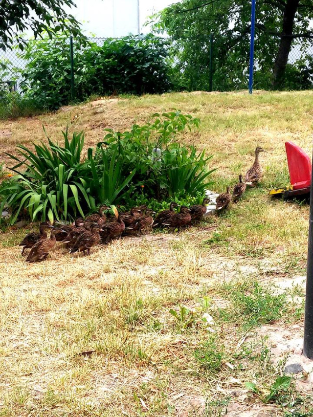Проживаємо на пр.Волі.Так от подібна ситуація була нещодавно у нашому дворі) Качка з маленькими каченятами попрямували до під"їзду,видно хотіли пересидіти там неймовірну спеку. Мешканці мусили викликати волонтерів з зоопарку,бо сусідський кіт намагався напасти на каченят. Качину сімейку успішно і скажу ще досить швидко виловили та доставили на постійне місце проживання в наш зоопарк)