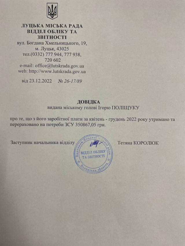 Луцький міський голова Ігор Поліщук, який активно долучається до збору допомоги на фронт, з квітня по грудень перерахував з власної зарплати на потреби ЗСУ 350 867,05 грн.