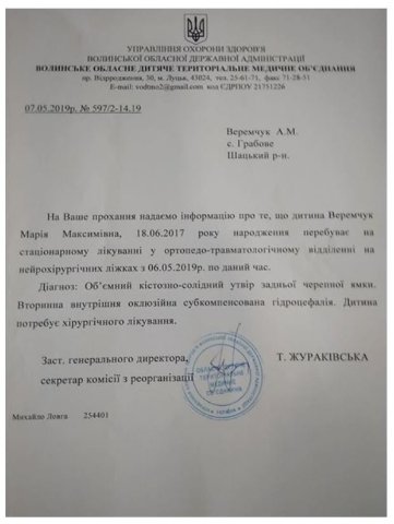Тітка хворої дівчинки розповіла, що пухлину виявили кілька днів тому, пише ВолиньPost. Зараз Марійка проходить обстеження у Волинській обласній дитячій лікарні. У неї діагностували кістозно-солідний утвір задньої черепної ямки, вторинна внутрішня оклюзійна субкомпенсована гідроцефалія.