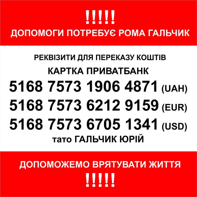 Усі охочі допомогти родині у боротьбі з хворобою, можуть перерахувати кошти на картку ПриватБанку 5168757319064871 Юрій Гальчик (тато хлопчика).