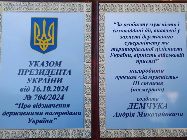 Нагороду з рук селищного голови Василя Камінського та т. в. о. заступника військової частини 1141 Національної гвардії України із роботи з особовим складом Віталія Пліска отримала мама загиблого Героя Катерина Демчук.