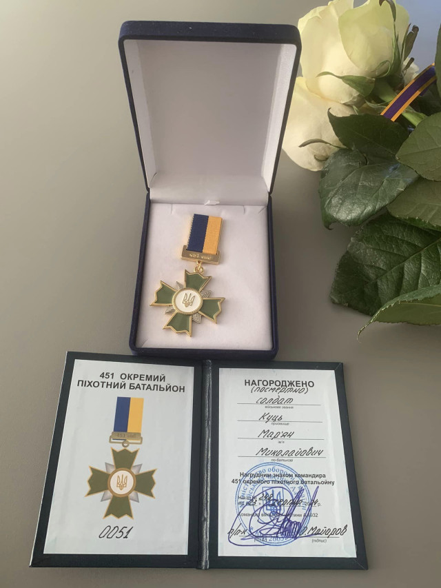 Наказом командира військової частини А 4932 від 23 серпня 2024 року N 248 Нагрудним знаком командира 451 окремого піхотного батальйону нагороджено (посмертно) солдата Куць Марʼяна Миколайовича,18.04.1984 р.н.
