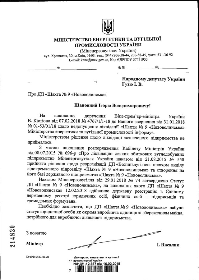 У Міністерстві енергетики та вугільної промисловості не приймали рішення про ліквідацію шахти №9 «Нововолинська». Таку відповідь за підписом профільного міністра Ігоря Насалика надали на зверненя нардепа Ігоря Гузя. Про це повідомили у прес-службі нардепа.