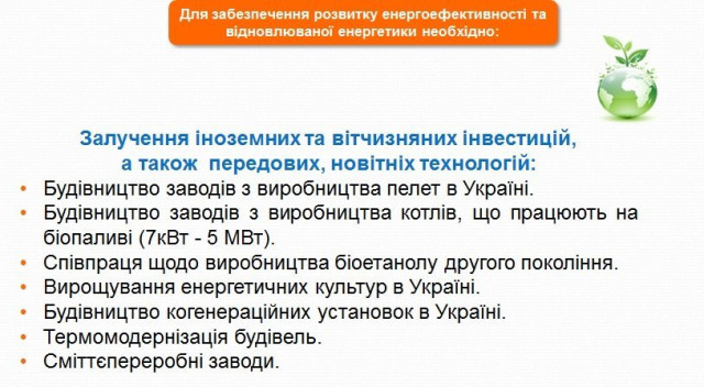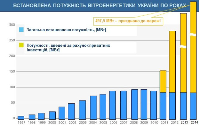 Прийнятий Урядом Національний план дій в ВДЕ до 2020 року ставить завдання перед сектором біоенергетики додатково замістити 5,27 мільярда метрів кубічних природного газу на рік твердим біопаливом, довівши його до 7,2 в 2020 році. Це потребуватиме значного нарощування використання теплогенеруючого обладнання на біомасі: з 3650 МВт в 2013 до 16150 МВт в 2020 році - фактично збільшення потужностей в 4,4 рази.Виконання поставлених цілей неможливе без швидкого нарощування енергетичного споживання аграрних відходів і палива з енергетичних плантацій. Потужність котлів, що працюватимуть на аграрних відходах і паливі з енергетичних плантацій, збільшуватиметься з 300 МВт (10%) в 2013 до 11000 МВт (70%) в 2020 році. Фактично збільшення споживання в 35 разів за найближчі 5 років.Щодо вітрових електростанцій, зі слів голови правління Української вітроенергетичної асоціації Андрія Конеченкова, об’єм встановлених в Україні потужностей становив 497,5 МВт у 2014 році. Нові проблеми перед цією галуззю енергетики постали з анексією АР Крим Росією - 87,7 МВт потужностей припадали на територію півострову.
