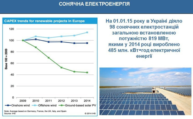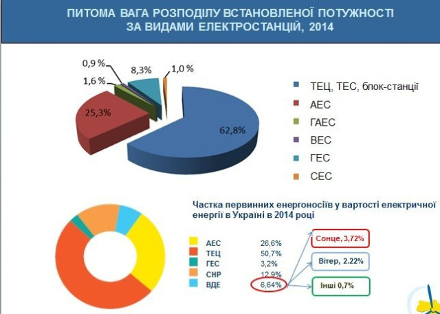 Загальна потужність сонячних установок приватних домогосподарств, що працюють за «зеленим» тарифом за станом на 1 січня 2015 року становила 83,5 кВт. Зазначеними установками у 2014 році вироблено 9389 кіловат-годин електричної енергії. Постачання електроенергії сонячними електростанціями, що знаходяться на тимчасово окупованій території Криму, до Об’єднаної енергетичної системи України припинено з квітня 2014 року. На території автономії залишилось 23 фотоелектростанції сумарною потужністю 407 МВт.Одночасно зі значним вітровим та сонячним потенціалом, який можна використовувати в Україні, перед використанням цих джерел енергії стоїть низка бар’єрів. Це, зокрема, відсутність державних гарантій щодо компенсації втрат інвесторів внаслідок форсмажорних обставин (анексія Криму, зона АТО) та те, що електростанції можуть бути побудовані тільки на землях, призначених для промислового користування.