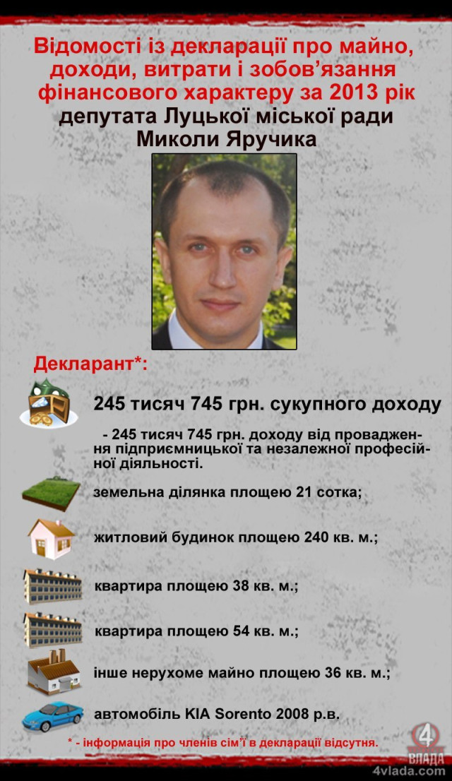 Абсолютним чемпіоном за кількістю землі та нерухомості серед половини обранців громади є депутат Луцької міської ради протягом 2010-2014 років, а нині депутат Київської міської ради, член ВО «Свобода», місцевий бізнесмен Олег Чернецький. Загалом у нього разом із членами сім’ї задекларовано за 2013 рік 14 земельних ділянок загальною площею майже у 3 гектари, 5 будинків загальною площею 1521,2 кв. м., 6 квартир загальною площею 244,1 кв. м. та 24 одиниці іншого нерухомого майна загальною площею 4667,1 кв. м. Також у членів сім’ї задекларований автомобіль.