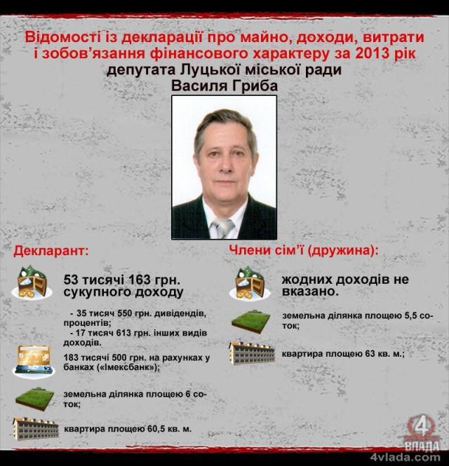 Гриб не артист театру. Він давно на пенсіі. А от його дружина пенсіонерка працюе в театрі,отримуе зарплату і весь час скаржиться,що син не працюе,чоловік (Гриб) ій грошей не дае,нещасна і бідна жіночка. А чомусь в деклараціі не вказана іі зарплата,пенсія. Та й його пенсія не вказана. А де це вони земельки хапанули,а квартирок де цапанули??? Корупціонри ,а не пенсіонери.