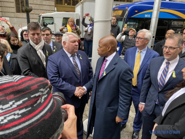 Мер Нью-Йорка Ерік Адамс взяв участь у церемонії підняття американського та українського прапорів на Мангеттені – у центральному районі міста.