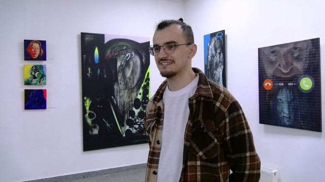 До образотворчого дійства в Галереї мистецтв також долучилися молоді художники. Диптих під назвою «Загальновійськовий захисний костюм» представив на виставці митець Олексій Синюк. Каже: його робота – це спогади з юності.