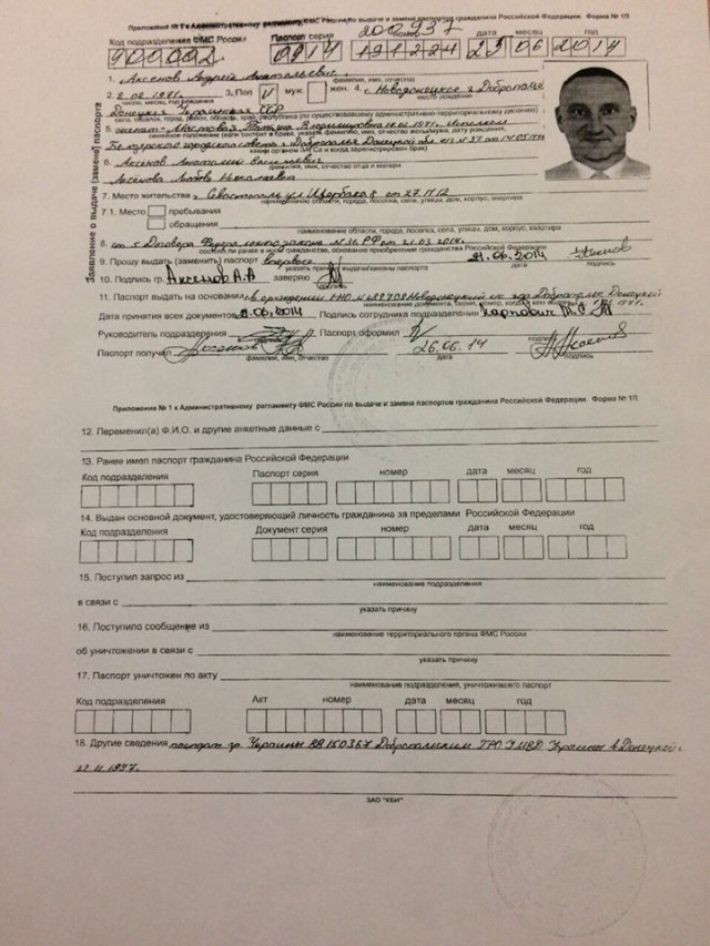 Як повідомив Лубинець, Аксьонов в 2014 році подав на отримання російського громадянства. Під час бойових дій влітку того ж року Аксьонов виїхав у аннексированный Крим, попросивши у окупантів надання російського паспорта. Місцем проживання в заявці він вказав місто Севастополь. Також, за деякою інформацією, Аксьонов 5 листопада цього року виїхав в Росію.