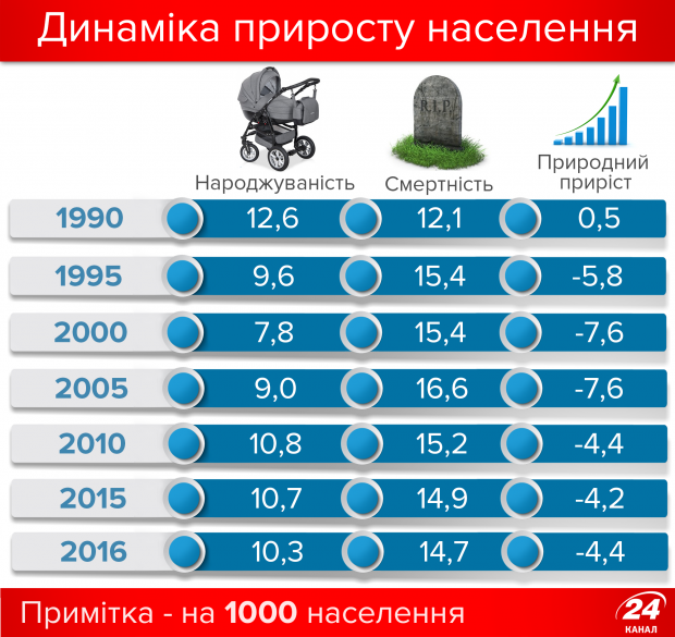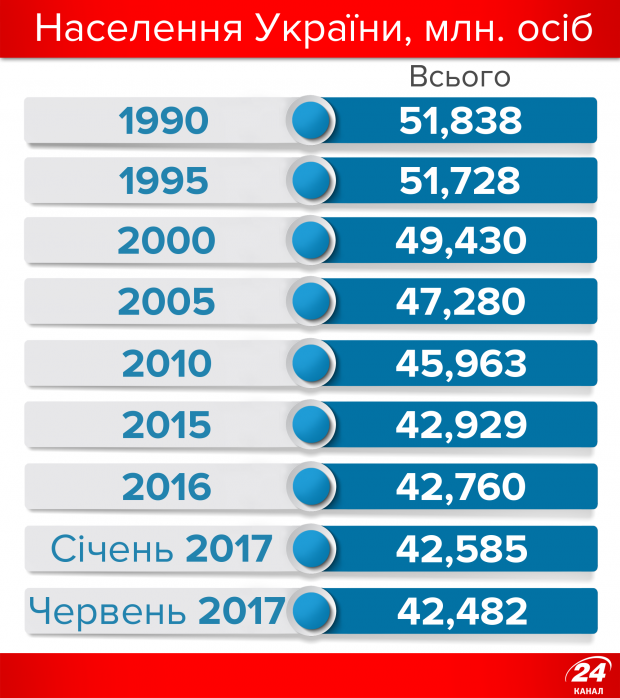 Зокрема, у 1990-му році населення України складало 51,8 мільйона осіб, за перші роки незалежності (до 1995-го) кількість населення зменшилась лише на 110 тисяч, а от після цього пішов серйозний спад – наша країна почала втрачати по 2,2-2,3 мільйона населення кожних 5 років. Станом на червень 2017 року населення України скоротилось до 42,482 мільйона осіб.