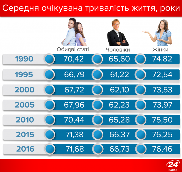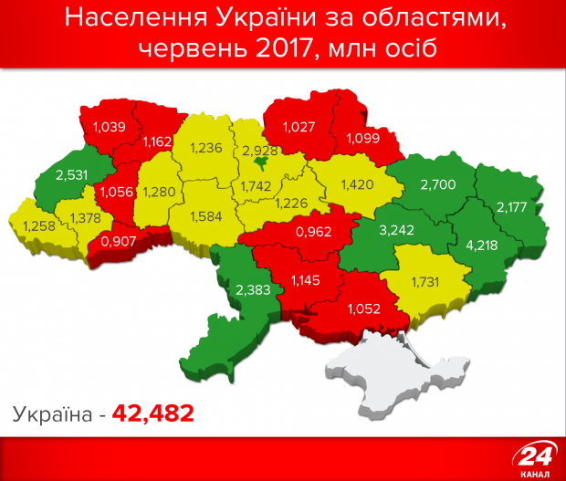 Що цікаво, кількість населення у віковій категорії «60+» майже не змінилась, навпаки – якщо у 1990 році літніх людей в Україні було 9,451 мільйона осіб, то у 2017 – 9,546 мільйона. Натомість кількість дітей та осіб віком 16-59 років відчутно зменшилась: дітей поменшало на 5 мільйонів (до 6,887 мільйона), а дорослих осіб – на 4,3 мільйона (до 26 мільйонів осіб).Якщо говорити про природній приріст населення, то він залишається від'ємним протягом всього періоду незалежності нашої держави, щоправда, останніми роками цей показник складає -4,4 на тисячу населення, в той час як у 2000-2005 роках цей показник склав -7,6 на тисячу населення.Одним із небагатьох позитивних демографічних показників є ріст середньої очікуваної тривалості життя – в Україні цей показник у 2016 році склав 71,68 роки (66,73 для чоловіків і 76,46 для жінок). Це більш ніж на рік перевищує показник 1990 року і майже на 5 років – показник 1995-го.Лідером за кількістю населення залишається Донецька область – незважаючи на бойові дії, тут проживає 4,218 мільйона осіб. У п'ятірці також Дніпропетровщина, Київ, Харківщина та Львівщина. А от у двох областях – Чернівецькій та Кіровоградській – загальна кількість населення вже не дотягує до 1 мільйона – відповідно 907 та 962 тисячі. Однак найближчим часом цей список може розширитись за рахунок Чернігівської (1,027 мільйона), Волинської (1,039), Херсонської (1,052) та Тернопільської (1,056) областей.