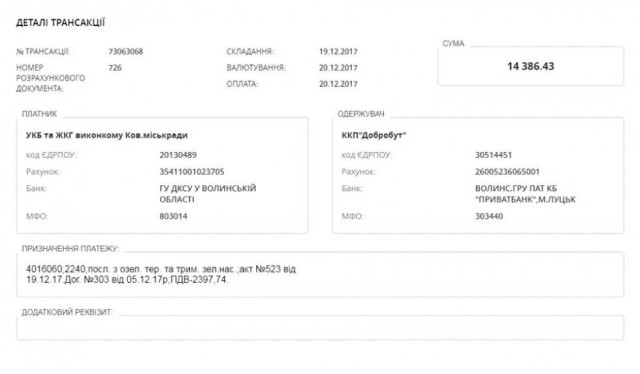 Управління капітального будівництва та житлово-комунального господарства виконкому Ковельської міської ради перерахувало комунальному підприємству «Добробут» за послуги з озеленення території та тримання зелених насаджень загалом 37 тисяч 875 гривень.