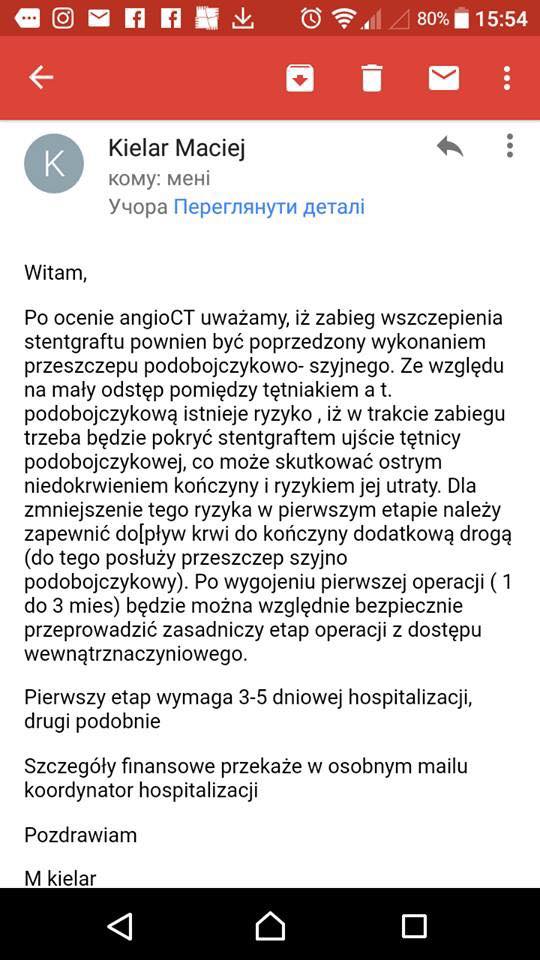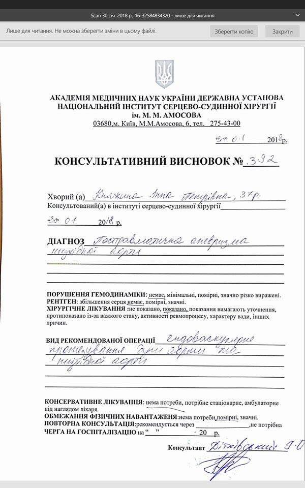 "В Україні низхідний відділ аорти оперувати та стентувати ніхто не взявся.. Інна знайшла клініку в Польщі MEDICOVER HOSPITAL та професора Maciej Kielar...В цій клініці найнижча ціна за життя Інни в Європі - 12 000 євро. ( враховуючи всі обставини клініка робить максимальну знижку). Професор Кєлар, судинний хірург, реальний професіонал своєї справи, клініка недалеко від рідної Волині – найменший транспортний розхід і знайомі громадяни Польщі, які знайшли цю клініку, надають житло на час перебування. Родина та друзі неймовірними зусиллями вже зібрали 7 300 Євро.