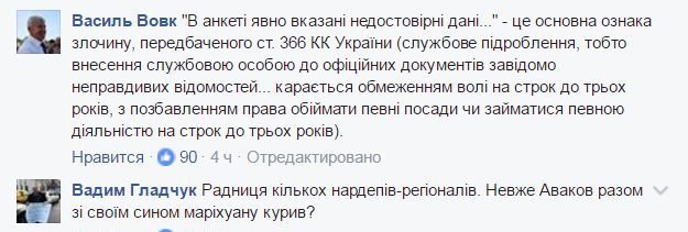 "В анкеті явно вказані недостовірні дані" - це основна ознака злочину, передбаченого статтею 399 КК (службове підроблення, тобто внесення службовою особою в офіційні документи явному неправдиві дані). Покарання - обмеження волі на строк до трьох років з правом обіймати певні посади строком до трьох років", - уточнив, коментуючи пост Геращенко, екс-начальник Головного слідчого управління СБУ Василь Вовк.