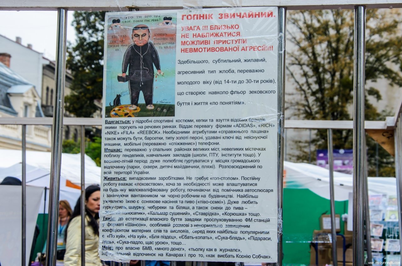 Досить незвичним чином представити книгу «Жлобологія» на Форумі видавців у Львові вирішив Антін Мухарський. Він посадив у клітку, як він їх назвав, двох «тварин» вимираючого виду - «гопніків троєщинських», демонструючи відвідувачам як анти-приклад. Бачили це все на власні очі та спілкувались з автором Волинські Новини, яким автор і розповів про проект.