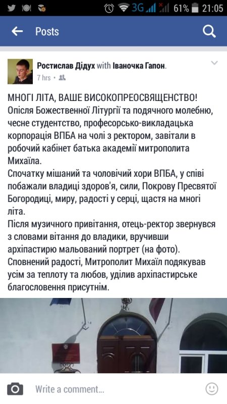"Опісля Божественної Літургії та подячного молебню, чесне студентство, професорсько-викладацька корпорація ВПБА на чолі з ректором, завітали в робочий кабінет батька академії митрополита Михаїла. Спочатку мішаний та чоловічий хори ВПБА, у співі побажали владиці здоров'я, сили, Покрову Пресвятої Богородиці, миру, радості у серці, щастя на многі літа.