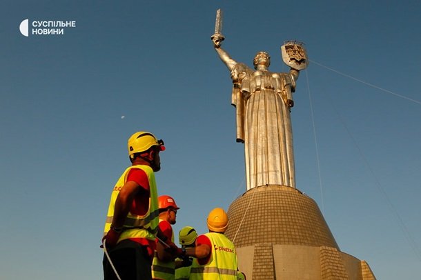 На монумент Батьківщина-мати у Києві встановили тризуб замість демонтованого радянського герба. Про це свідчать фото Української правди та Суспільного.