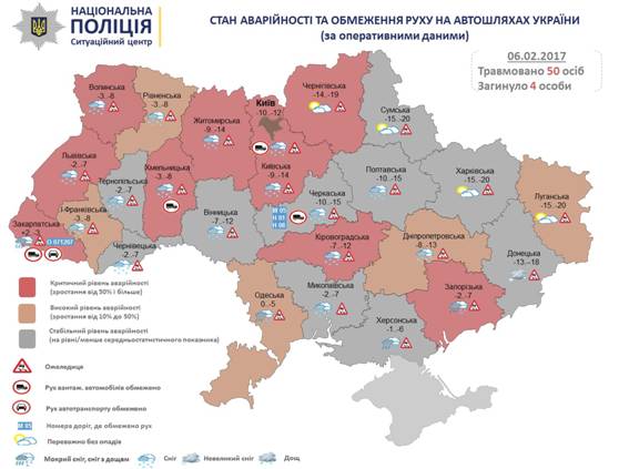 За минулу добу на автошляхах України загинуло четверо громадян, травмовано – 50. Сьогодні, 7 лютого, у деяких регіонах обмежено рух транспорту. Критичною за рівнем аварійності залишається ситуація в дев’яти областях країни.