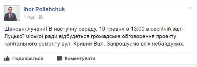 З його слів, всі охочі можуть взяти участь в обговоренні.Нагадаємо, фахівці вивчають, як саме має ремонтуватися покриття центральних вулиць міста. І попри відсутність у бюджеті Луцька 5 мільйонів на реконструкцію вулиці Кривий Вал, як це планувалося раніше, від ремонту вулиць Богдана Хмельницького і Кривий Вал в місті не відмовилися, проте проекти ще не затверджені.