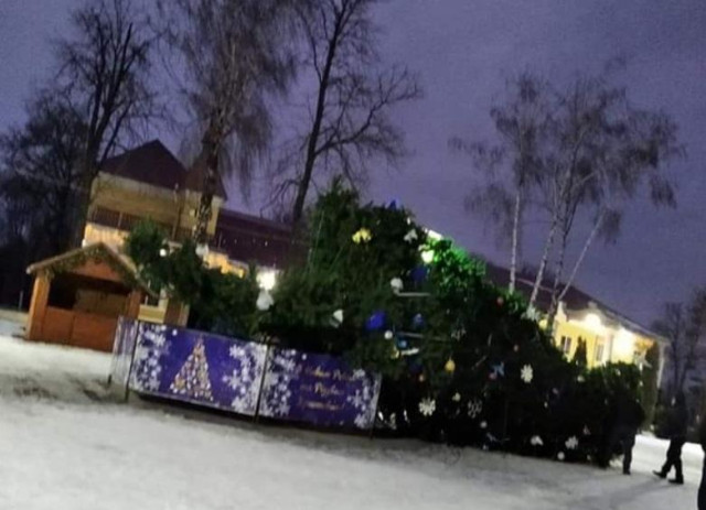 У місті Дунаївці Хмельницької області головна новорічна ялинка впала через сильні пориви вітру.