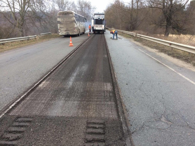 Зазначають, що роботи виконує підрядне підприємство ТзОВ «Автомагістраль-Південь». На вказаному відрізку дороги проводиться фрезерування зношеного дорожнього покриття та планування узбіч.