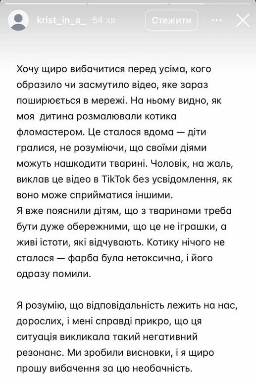 Жінка стверджує, що пояснила дітям про те, як варто поводитися із тваринами. За її словами, пізніше кота помили, а фарба з фломастерів була нетоксичною, тому улюбленцю «нічого не сталося».