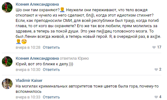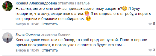 «Я не бачила його в труні, а вірити його рідним і близьким не збираюся», «Навіть якщо там не Захар, то труна навряд-чи порожня. Просто перший час поохороняють, а потім уже не зрозуміло буде хто там...», – пишуть коментатори.