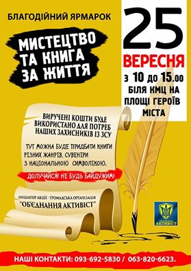Благодійний книжковий ярмарок «Мистецтво та книга за життя» заради допомоги бійцям, які перебувають у зоні АТО, відбудеться 25-ого вересня з 10-15 години.