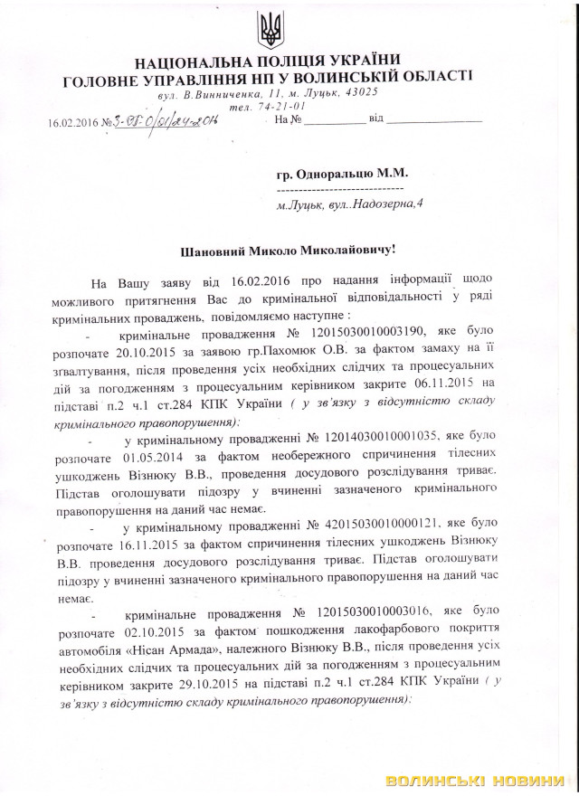 Сьогодні журналісту видання пан Одноралець надав копію заяви-роз’яснення за підписом головного поліцейського Волині Петра Шпиги, де вказано, що «кримінальне провадження № 12015030010003190, яке було розпочате 20.10.2015 за заявою гр. Пахомюк О.В. за фактом замаху на її зґвалтування, після проведення усіх необхідних слідчих та процесуальних дій за погодженням з процесуальним керівником закрите 06.11.2015 на підставі пункту 2 частини 1 статті 284 КПК України (у зв’язку з відсутністю складу кримінального правопорушення)».Мотиви такої поведінки активістів ГО «УНСО-Волинь» чоловік пояснює нібито замовними діями з боку Візнюка Володимира, який у минулому був його тестем.