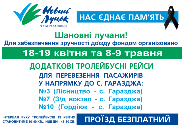 Окрім того, для забезпечення зручності доїзду у Гаразджу Фонд Ігоря Палиці «Новий Луцьк» організував додаткові тролейбусні рейси у ці дні. Про це повідомляють у прес-службі Фонду.