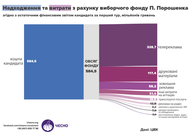 Петро Порошенко виступив єдиним донором власної виборчої кампанії, що склала 585 мільйонів гривень. Найбільше коштів кандидат витратив на рекламу на ТБ та зовнішніх носіях
