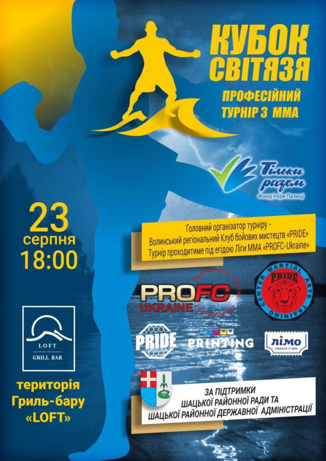 Організатори турніру – Волинський регіональний Клуб бойових мистецтв «PRIDE» за підтримки Шацької районної ради та районної державної адміністрації. Генеральний партнер турніру – Фонд Ігоря Палиці «Тільки разом».Читати ще: Змагання з ММА «Кубок Світязю»: показали, як «гартується сталь»