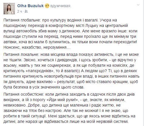 «Учора на пішохідному переході в комфортному місті Луцьку на центральній вулиці автомобіль збив маму з дитинкою. Але мене вразило інше: коли пішоходи ступили на перехід, перед ними проїхало ще як мінімум три автівки, хоча всі мали б зупинитись, як тільки вони почали переходити! Нонсенс, нахабство, нерозуміння», - написала Ольга Бузулук.