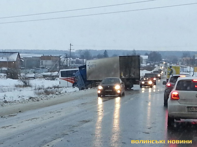 Великогабаритний автомобіль так занесло на дорозі, що він летів прямісінько на технікум, але водієві вдалося вивернути кермо і зупинити авто. Воно зупинилося всього за кілька метрів від навчального закладу та вперлося у стовп. За версією свідків, водій фури ніби не постраждав. Наавтодорогах Горохівщини страшенна ожеледиця. Жодної техніки, яка ліквідувала б лід на трасі немає.