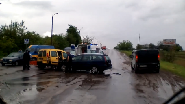 До чого тут дощ чи вибоїни? Сітроен на швидкості влетів ззаду в кенго, яке готувалося до повороту на заправку з лівого ряду, водій сітроена був випивший. От і вся причина!